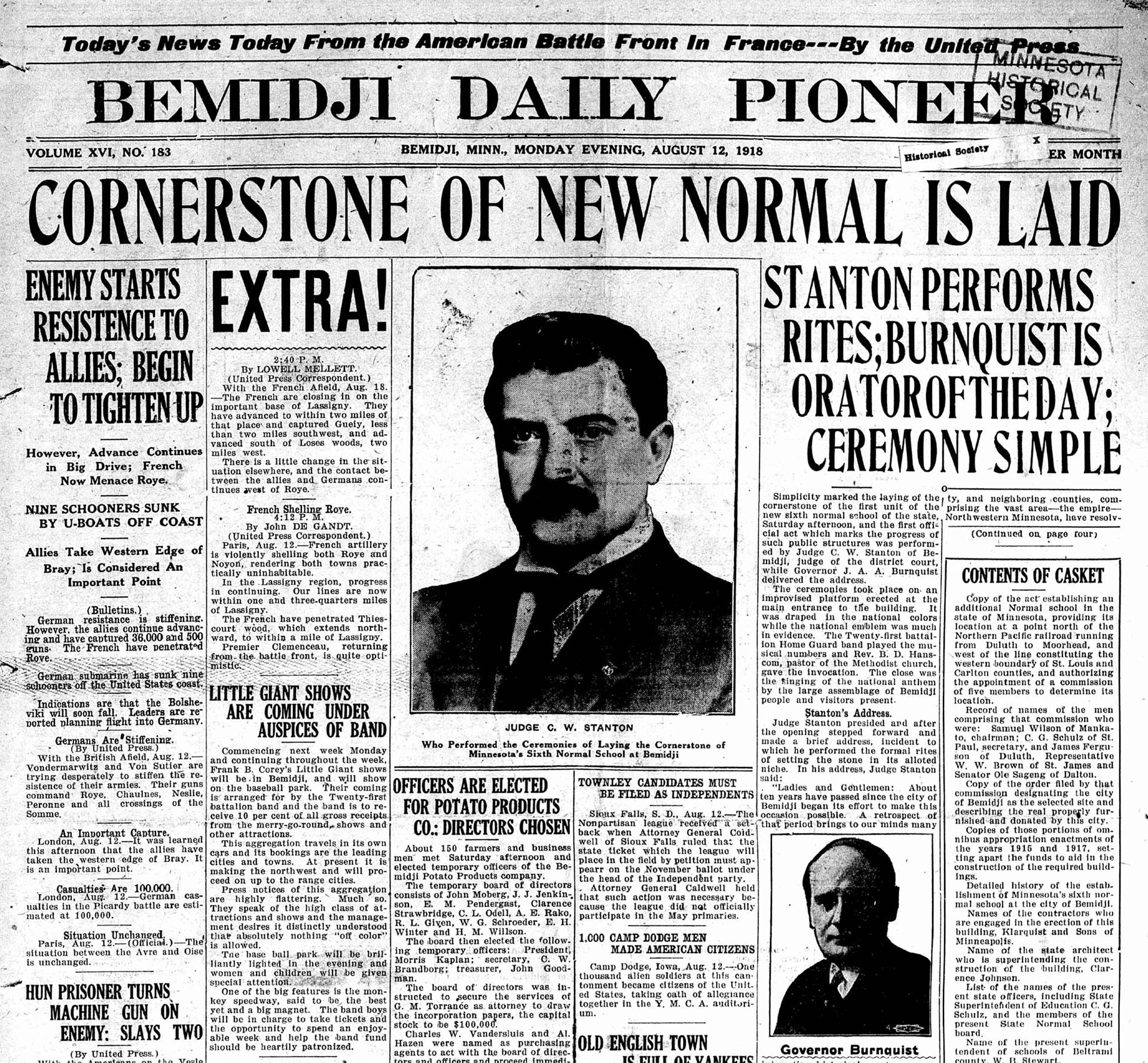 Simplicity marked the laying of the cornerstone of the first unit of the new sixth normal school of the state Saturday afternoon, and the first official act which marks the progress of such public structures was performed by Judge C.W. Stanton of Bemidji, judge of the district court, while Governor J. A. A. Burnquist delivered the address.