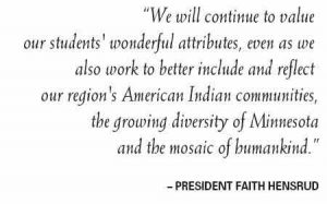 “We will continue to value our students’ wonderful attributes,” she said, “even as we also work to better include and reflect our region’s American Indian communities, the growing diversity of Minnesota and the mosaic of humankind.”