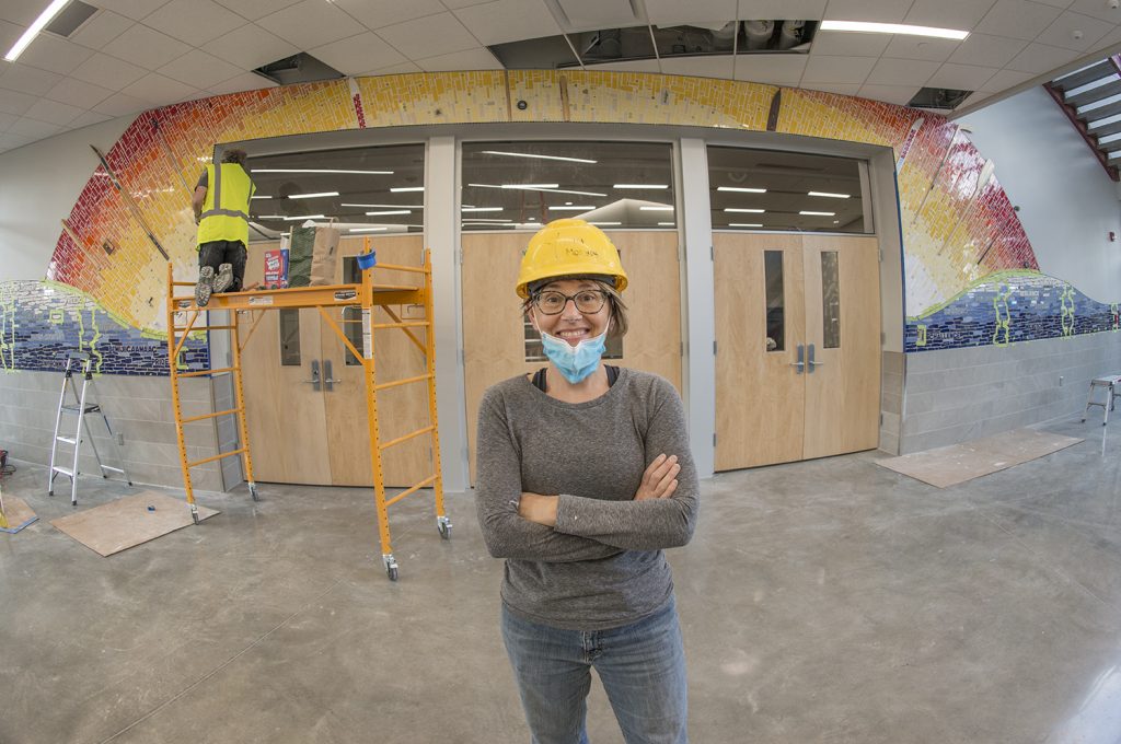 After months of hand-cutting thousands of pieces of material, Goodman and her team spent nearly three days unloading, staging and installing the mosaic.