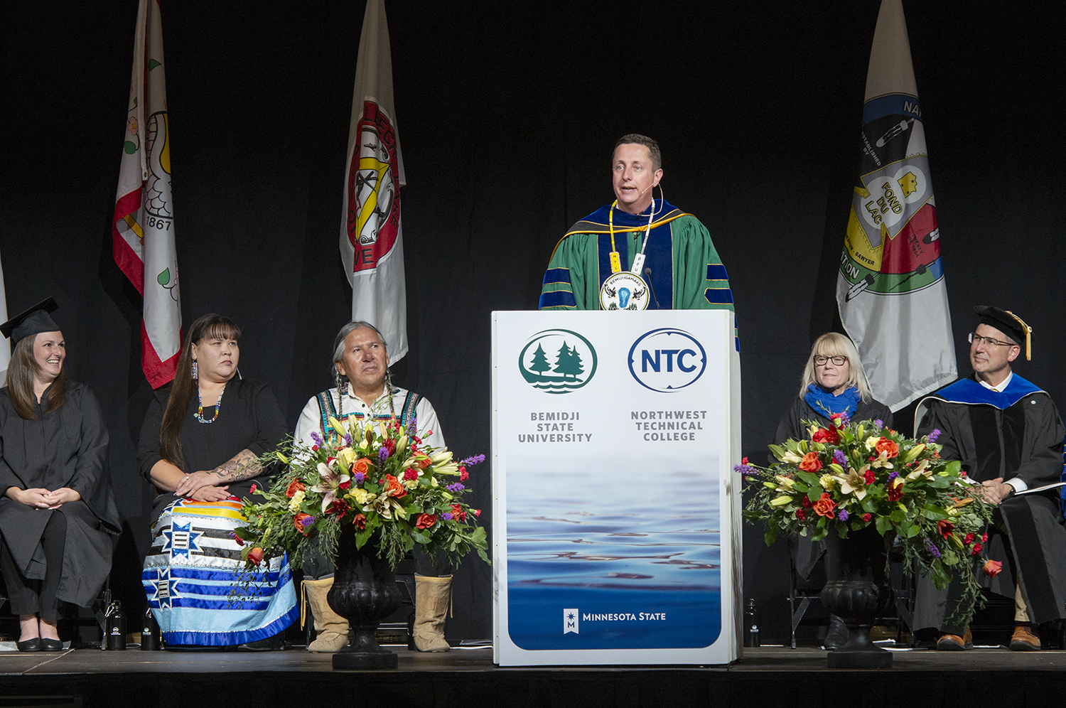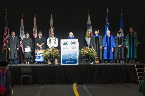 The 2 p.m. ceremony began with an Academic Procession into the BSU gymnasium in the Physical Education Complex and included remarks from Pebaamibines, associate professor of Indigenous studies, Kim Lynch, vice president for academic affairs (interim) at Northwest Technical College, Dr. Allen Bedford, provost and vice president for academic affairs at Bemidji State University, Mr. Joe Grabowski, president of the Bemidji State University Foundation board, Erin Ecternach, president of the Northwest Technical College Foundation Board, Devinder Malhotra, chancellor of Minnesota State, Roger Moe, Board of Trustees chairperson and Chrissy Downwind, executive director of the American Indian Resource Center.