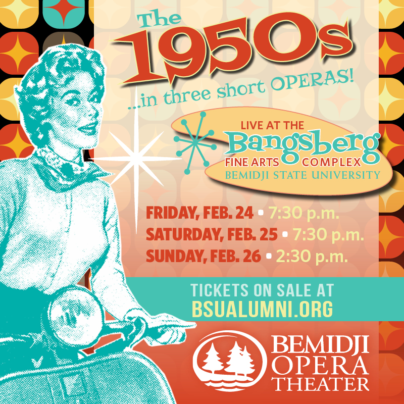 These themes and others will be presented in a throwback to “simpler” times by BSU students in Bemidji State Opera Theater’s production of “The 1950s In Three Short Operas” on February 24, 25 and 26.